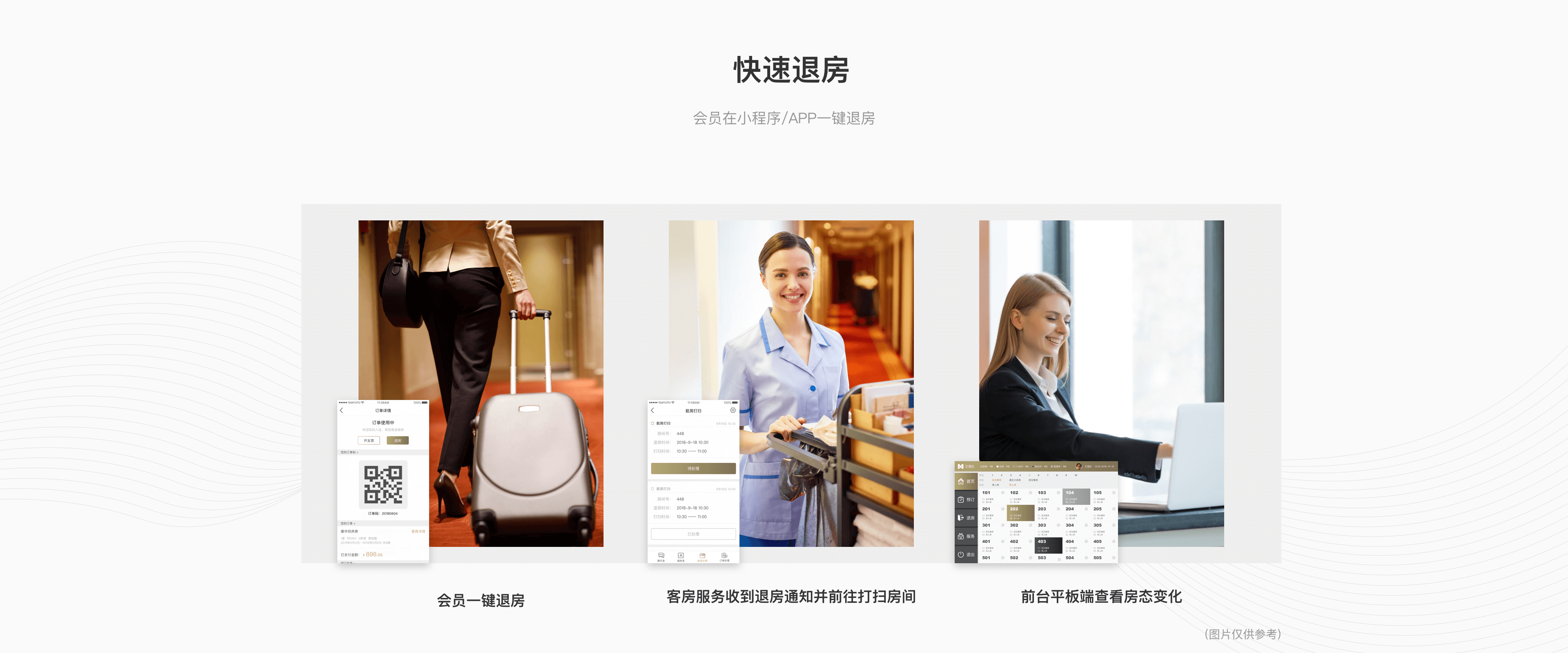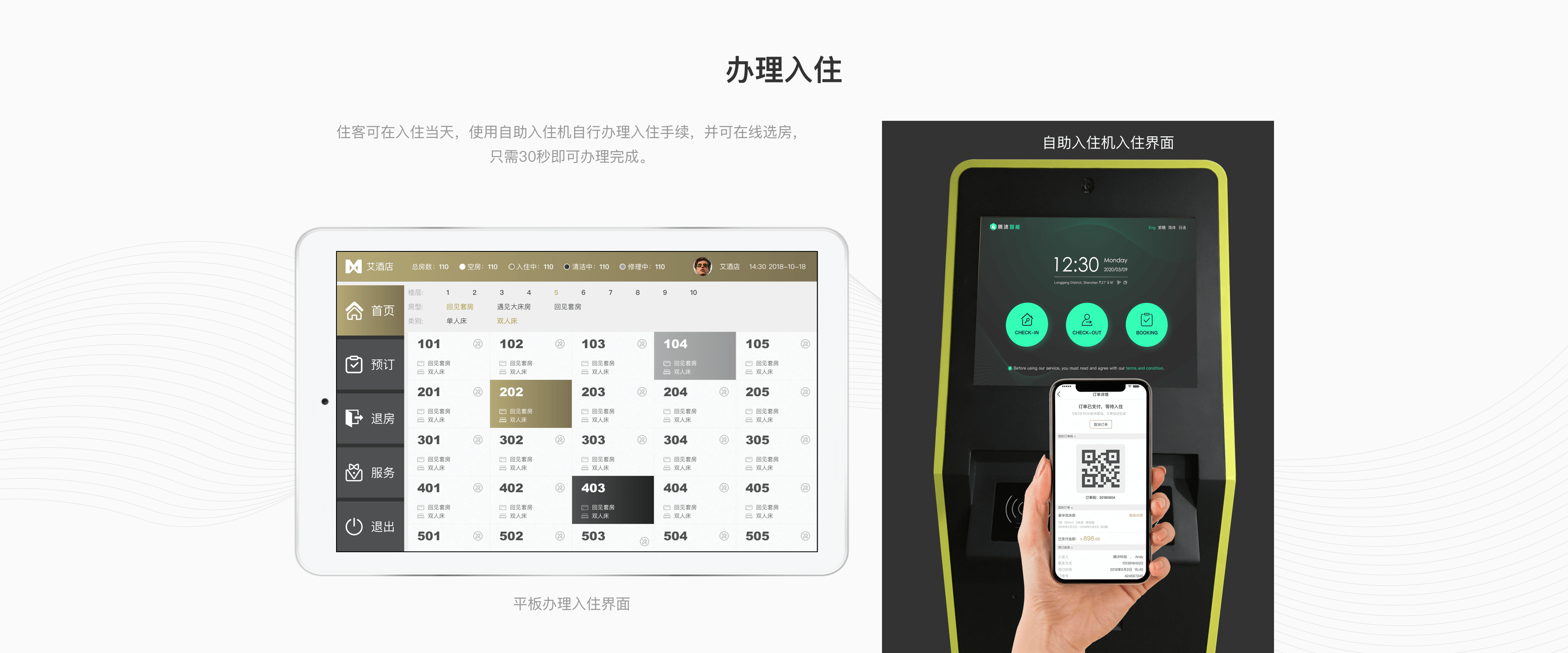 节省人工成本,加快客户办理入住流程,可选择手机开门或房卡开门,并提供自助退房客房管理APP